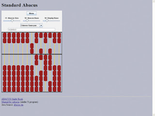 Em sua forma usual, o ábaco tem várias varas - cada uma delas representando uma potência de 10 - na qual os grânulos são encadeados de modo que está livre para deslizar para cima e para baixo. Se você deseja ter visão de como este mecanismo auxilia pessoas com aritmética simples, dê uma olhada no ábaco JavaScript.